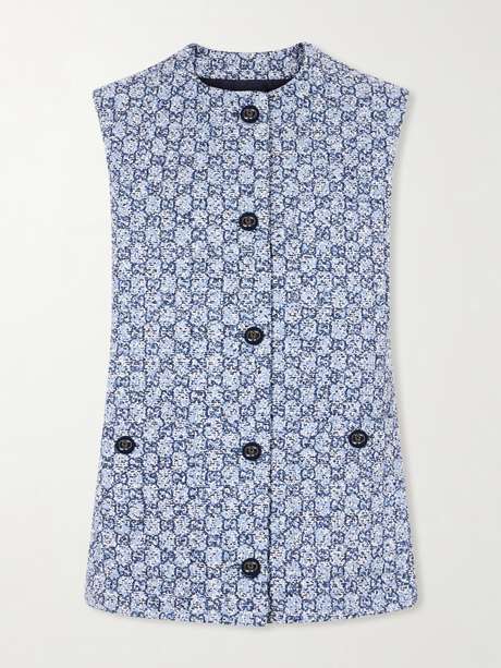 Gucci’s gilet has a timeless appeal. Made from cotton and wool-blend tweed, it’s detailed with contrasting logo-embellished buttons through the front and on the patch pockets. Style yours with the matching mini skirt.