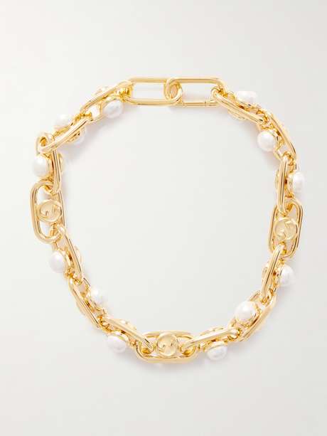 Gucci's necklace has statement, oversized chain links that incorporate the label's logo. It's made from polished gold-tone metal and set with lustrous faux pearls.