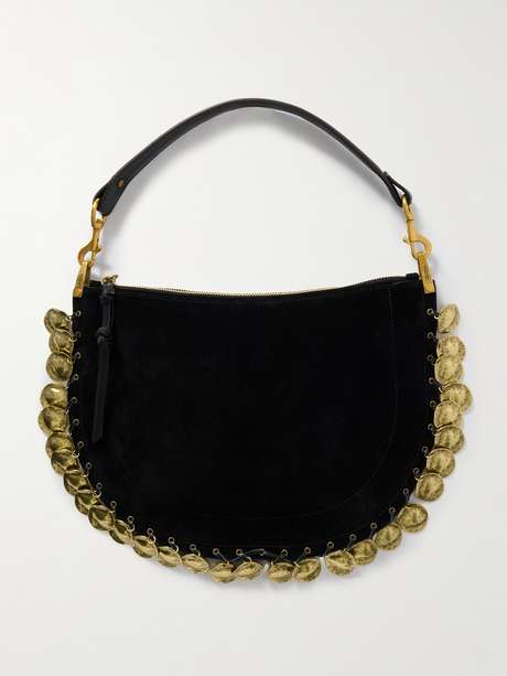 Isabel Marant's bag has instant it-girl appeal. Made from soft suede, it's trimmed with leather and embellished with hammered medallions around the curved shape. Keep smaller items in the accompanying zipped pouch.