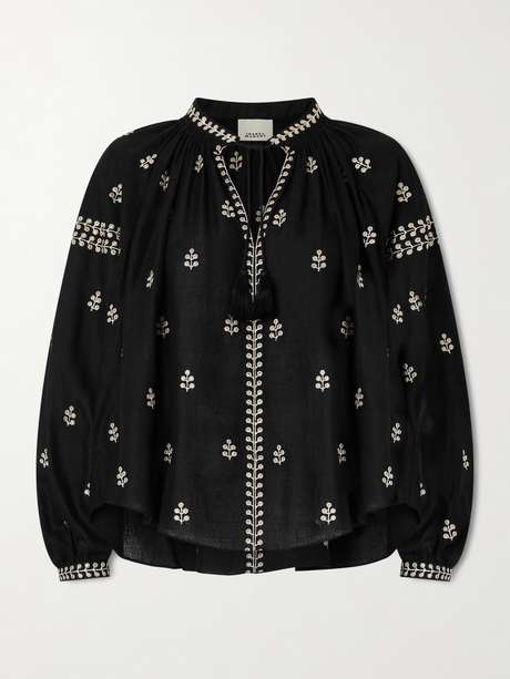 Isabel Marant's 'Rodis' blouse perfectly balances bohemian charm with Parisian nonchalance. Made from lightweight breezy silk, it features golden floral embroidery and has tassels along the front. Pair it with fringed boots.