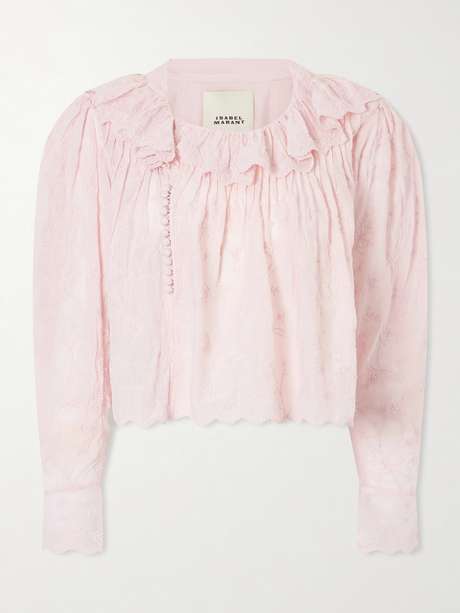 Isabel Marant’s 'Zelly' top exudes bohemian charm. Made from a cotton and silk-blend embroidered with floral motifs, it features a ruffled neckline and puffed sleeves for a distinctly feminine finish.