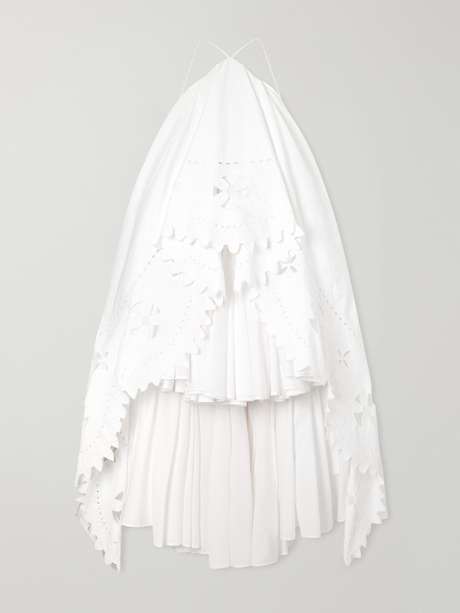 Jacquemus’ Spring/Summer ’26 collection draws from the simple beauty of rural life that shaped the creative director’s early years. This 'Provençale' dress cascades in voluminous cotton-poplin tiers, revealing an open back framed by a delicate overlayer traced with broderie anglaise that softly frames the silhouette, extending into floor-sweeping trains at the sides.