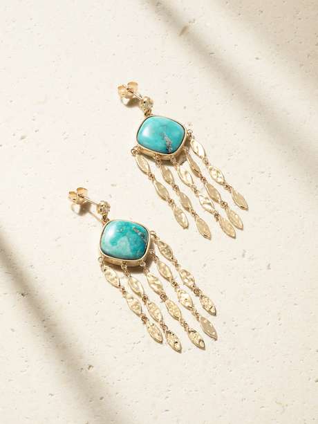 Jacquie Aiche's 'Sophia' earrings are inspired by her Native American heritage, with swaying 'feather' charms that nod to traditional dreamcatchers. They're made from 14-karat gold with petite diamonds and turquoise, which is often considered to be sacred in indigenous communities.