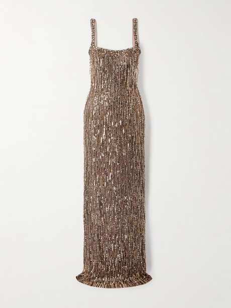 Jenny Packham's 'Fleur' gown is cut from sheer tulle and detailed with bead and seqin-embellished fringing. It has a close fit and an elegant square neckline.