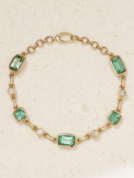 JIA JIA’s bracelet is adorned with faceted green tourmalines - the stone is said to bring abundance and healing to its wearer. It’s handcrafted from gold and interspersed with sparkling diamonds.