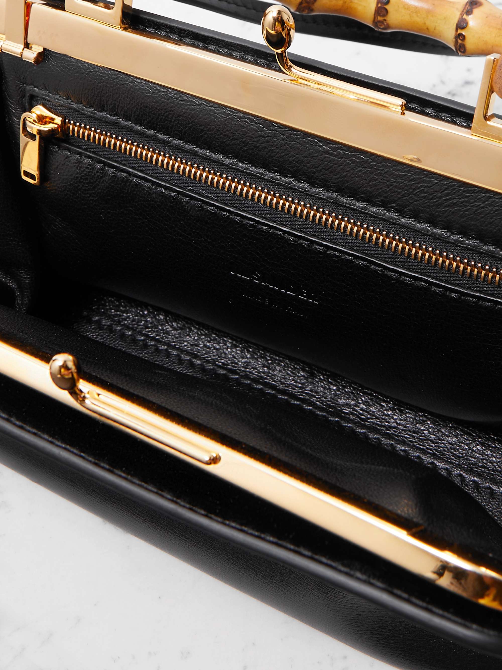 Jil Sander’s tote is characterized by the signature bamboo top handle. It’s crafted from supple black leather with enough space for small essentials, like your phone and lipstick, and features a zipped internal pocket to secure your cards.