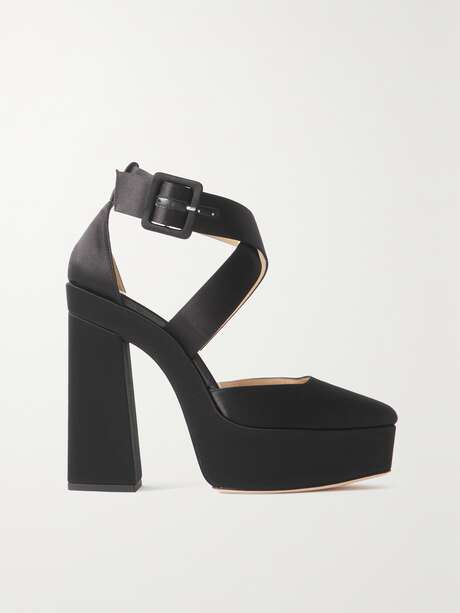 Get the party started with Jimmy Choo's 'Gian' pumps. Perfect for those who love a platform, they've been made in Italy from lustrous black satin and have smooth leather soles for durability.