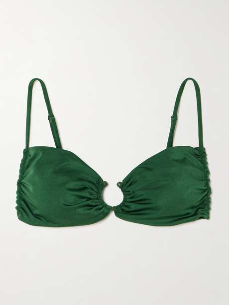Johanna Ortiz' 'Tangle Up' bikini top is named after the slim, shell-tipped ties that you can adjust to your preferred fit. It's made from green stretch fabric that's gathered and pierced with a tonal O-ring at the center. Wear yours with the matching briefs in our edit.