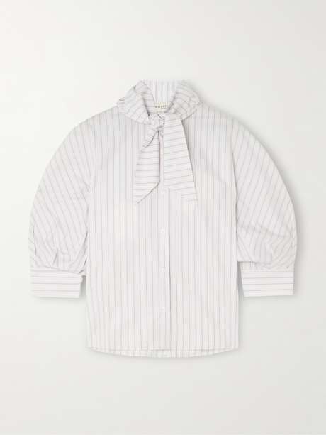KALLMEYER's 'Lilette' shirt has a chic exaggerated collar that can be left open or tied into an artful knot. It's made from crisp cotton-blend poplin with smart pinstripes and has three-quarter length sleeves.