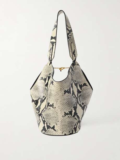 The unstructured, sculptural shape of KHAITE's 'Lotus' tote is inspired by the fluidity of a scarf. It's made from snake-effect leather with a round base and slim top handle that fits comfortably over the shoulder. There's enough space inside for your phone, keys, sunglasses and a slim wallet.