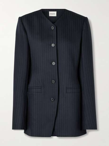 KHAITE's 'Naran' blazer is defined by its chic, collarless design. It has a herringbone finish and white pinstripes, as well as lightly padded shoulders to contrast the nipped-in waist. The full satin lining ensures easy layering.