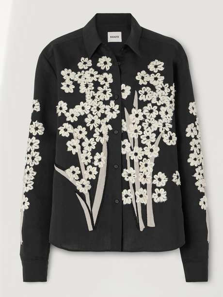 Creative Director Catherine Holstein explores the notion of imperfection for KHAITE's Spring '26 collection. Worn on the runway, this 'Argo' blouse is made from silk and cotton-blend and beautifully appliquéd with flowers and leaves. Take cues from the show styling and leave the first few buttons undone.