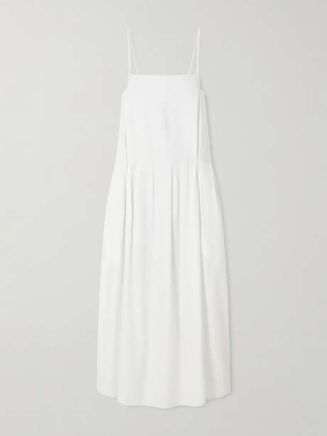 KHAITE continues to define modern elegance with garments that balance architectural precision and effortlessness. This 'Adira' dress is cut from crisp cotton-poplin, falling from a structured bodice into a softly pleated skirt that creates beautiful movement and volume. Pair yours with minimal sandals for a refined warm-weather look.