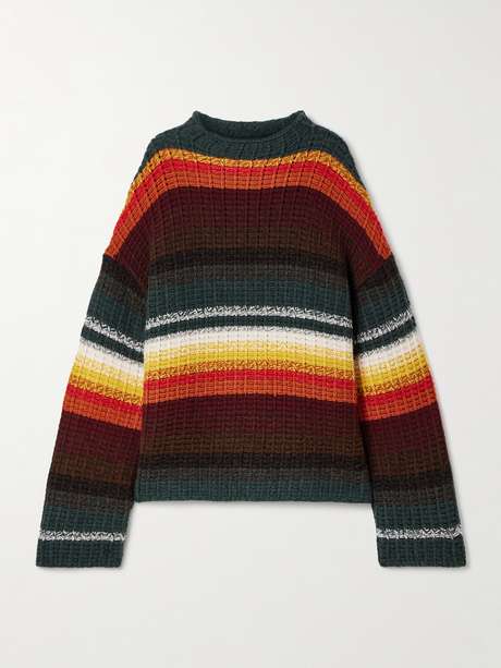 The chunky handle and oversized fit of KHAITE’s ‘Yanis’ sweater make it all the more cozy. It’s knitted from naturally insulating cashmere and has earth-toned horizontal stripes and a ribbed finish.