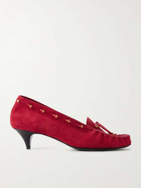 KHAITE has long championed modern femininity through nuance and unexpected detail – qualities embodied in these 'Milly' pumps. They're made from smooth suede and traced with whipstitching threaded with gold-tone beads. The petite heels offer 35mm of height.