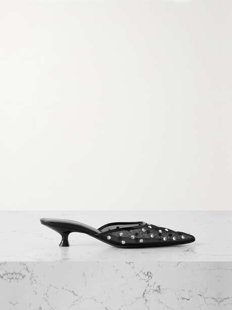 Khaite's 'Minna' mules are made from semi-sheer tulle that's dotted with light-catching crystals, making them ideal for evening events. They're trimmed with glossy patent leather and have sleek pointed toes and kitten heels. Wear yours with a dress or tailoring.