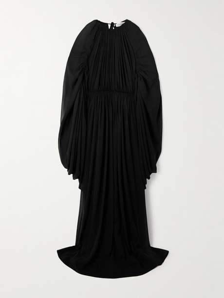 Lanvin’s gown pays tribute to the elegant silhouettes of the 1920s and ’30s—an homage to the timeless designs of founder Jeanne Lanvin. It's made from weightless silk-chiffon that's gathered along the neckline and waist and has voluminous sleeves that create the illusion of a cape. The train trails elegantly behind as you walk.