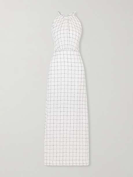 LIBEROWE’s 'Celeste' dress is made from cotton-blend tweed in a classic check motif. It features a blouse-style top with gentle gathers at the halter neckline for added volume, paired with a fitted, column-length skirt that accentuates the waist. Style it with high-heel sandals and an updo for a polished, special-occasion look.