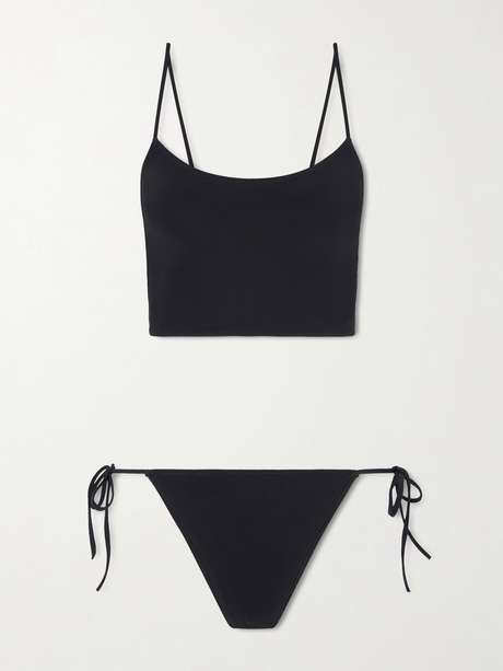 Lido’s 'Novantaquattro' bikini features a tank-style top with a straight neckline and spaghetti straps, paired with adjustable side-tie bottoms. It’s made from stretch fabric and is perfect for styling with flip-flops and oversized sunglasses for beach or pool days.