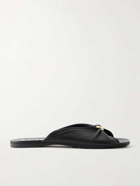 Loewe’s 'Pebble' slides, created in collaboration with Paula’s Ibiza, feature the brand’s signature gold-tone hardware. Made from smooth leather, they have square toes and flat soles for effortless, all-day comfort.