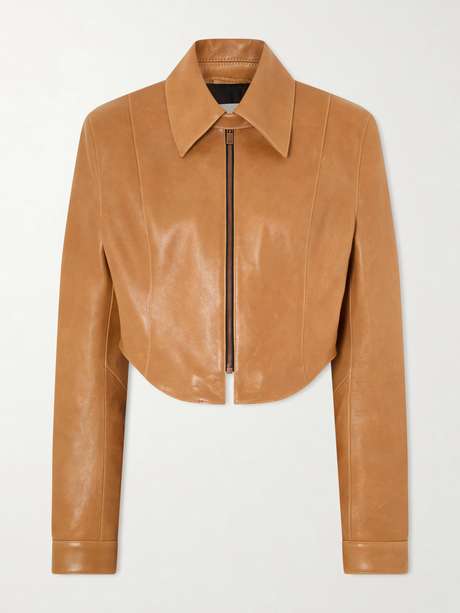Magda Butrym creates sculptural, statement-making womenswear with this jacket. Crafted from supple leather, it features a cropped, curved hem and refined tailored seams that shape the silhouette. The broad pointed collar can be worn flat or lifted for an added fashionable detail.