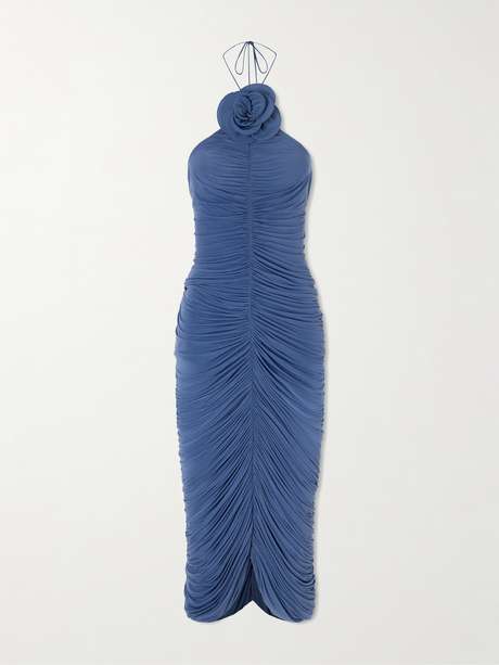 Magda Butrym’s dress embodies the label’s signature romanticism. Cut from stretch-jersey and artfully ruched for a close fit, it’s adorned with a floral appliqué at the delicate halter neckline.