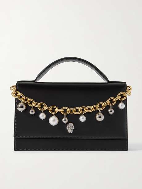 McQueen's tote is adorned with the label's signature skull motif and a gold-tone chain strung with faux pearls and light-catching charms. It's made from smooth leather and has an internal slip pocket for your cards. Stow your compact, keys and lipstick inside.