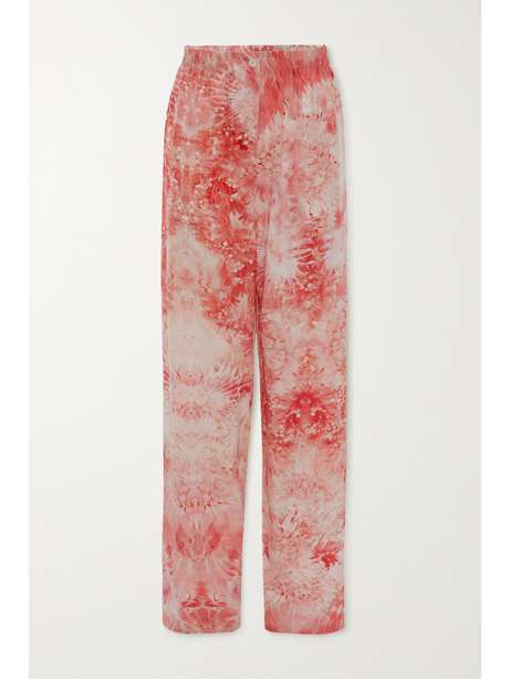 Alexander McQueen's pants are printed with a semi-abstract motif that brings to mind delicate coral reefs. They cut from silk that drapes effortlessly through the wide legs.