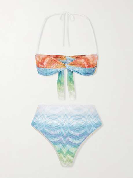 Missoni’s bikini showcases the house’s signature chevron motif. Crocheted in an ombré palette, it features a softly gathered top that enhances the textured design.