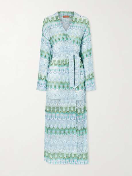 MISSONI Belted metallic crochet-knit kaftan