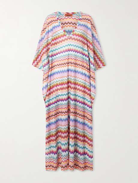 Missoni's kaftan is crochet-knit with a pixelated version of the label's colorful zigzag stripes. Flecked with glistening metallic threads, it has an enveloping shape with fluttery sleeves. Slip yours on over a coordinating bikini.