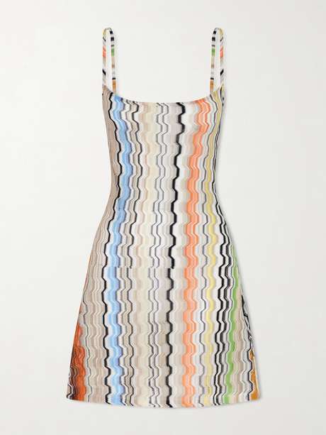 The house’s iconic zigzag is formed through controlled variations in stitch and tension, a hallmark of Missoni’s knitwear innovation. This mini dress is crochet-knit with metallic yarns, creating a close yet flexible fit that glimmers with movement.