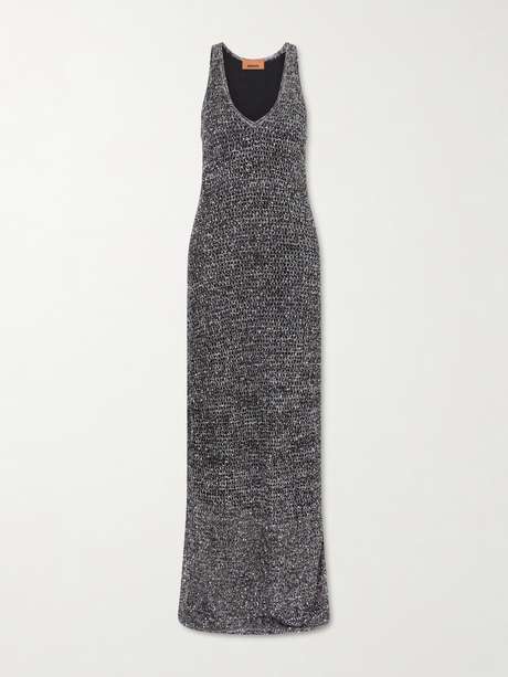 Missoni’s mastery lies in its manipulation of open-knit structures, where mesh becomes a canvas for texture and light. This maxi dress is embellished across its fluid silhouette, with the sheer construction revealing the intricacy of the underlying technique.