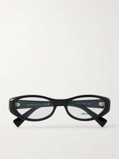 Miu Miu’s optical glasses are crafted from glossy black acetate in a softly rounded frame. Subtle curves through the silhouette lend them a refined, retro-inspired feel, while slim arms keep the profile streamlined.