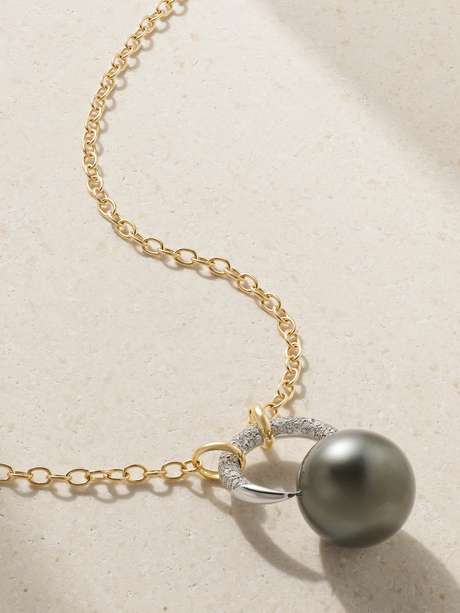 Mizuki's necklace is adorned with a black pearl suspended from a diamond-dusted 18-karat white gold pendant. It's strung on a contrasting yellow gold chain.