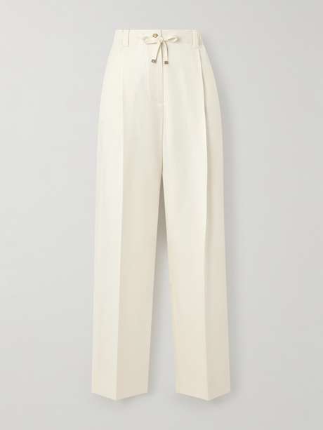 Moncler's wide-leg pants are tailored from wool-gabardine with a fluid drape that inspires a relaxed dress code. They're pleated to define the shape and fitted with a drawstring waistband for optimal comfort. The discreet leather logo patch acts as a mark of enduring quality.