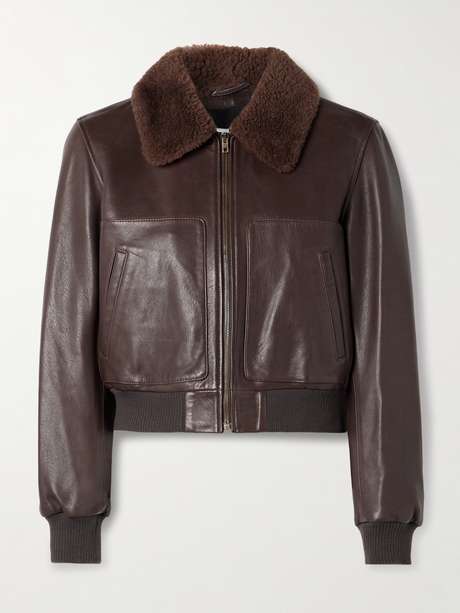Nili Lotan's love for the '70s rock-and-roll era informs her brand's Fall '25 collection. This 'Tom' jacket is made from dark-brown leather and topped with a tonal shearling collar. It has a boxy shape cinched by ribbed trims and a full twill lining for smoothness.