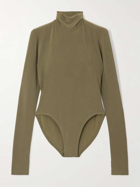 Bold, figure-skimming styles have been a part of Norma Kamali's DNA since the '70s. Cut from slinky stretch-jersey, this bodysuit has a slim turtleneck and long sleeves with cutouts to slip your thumbs into. Layer yours under everything from skirts and dresses to classic jeans.