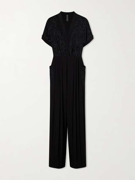 Norma Kamali’s 'Geralyn' jumpsuit plays on contrast. Designed with a mesh bodice traced with embroidered velvet motifs, revealing subtle glimpses of skin beneath, it falls to tailored wide legs.