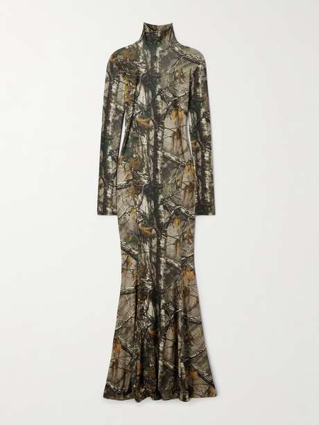 Norma Kamali's turtleneck gown is made from the brand's signature jersey, which offers comfortable four-way stretch. It's printed with a realistic camouflage motif that's sure to be a point of conversation at your next event and has a floaty, floor-skimming hem.
