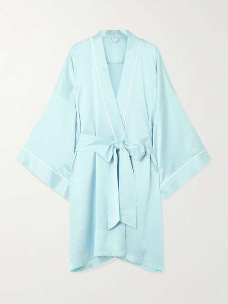 Olivia von Halle's 'Mimi' robe is cut from soft silk-satin in a kimono-inspired silhouette. Finished with ivory piping, it has wide sleeves and a detachable belt. Wear yours while lounging around the house or over a dress in the evening.