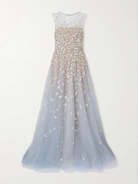 Oscar De La Renta's gown is embellished with sequins and mother-of-pearl paillettes that'll glisten and sparkle in every direction at an event. It's cut from tulle with an illusion strapless neckline and a full skirt that graduates into a pretty shade of blue. Lift the maxi hem with heels.