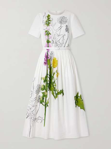 Oscar de la Renta's dress is printed with an illustrated foxglove and dandelion to create the illusion of a half line-drawn, half watercolored work of art. It's cut from cotton-blend poplin, has a structural bodice and voluminous skirt and comes with a coordinating belt.
