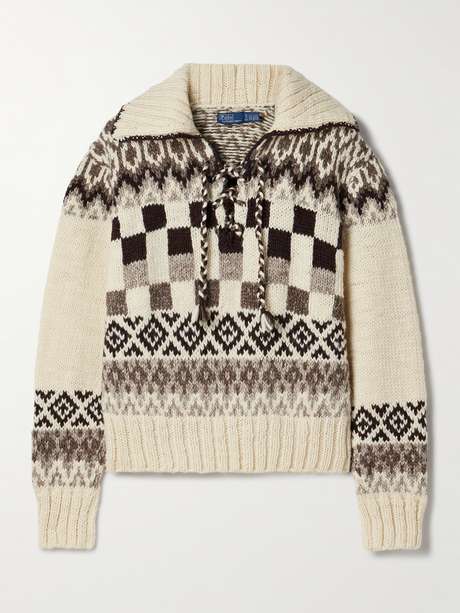 Polo Ralph Lauren's sweater is knitted with a cozy Fair Isle pattern and tonal checks. Made from wool, it's traced with ribbed trims and has lace-up collared neckline.