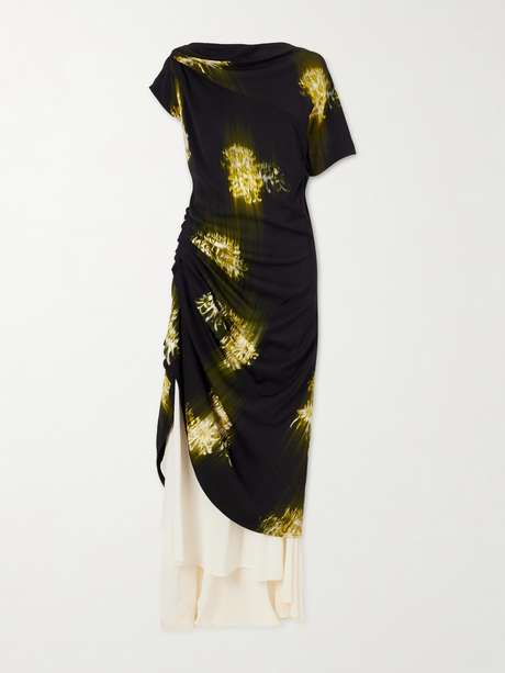 Proenza Schouler’s ‘Antonella’ dress debuted on the Spring ’26 runway, reflecting the label’s striking use of print. Draped from fluid cady, it’s patterned with luminous bursts and shaped with a subtly gathered waist that falls to an asymmetric hem, revealing a contrasting tiered underlayer.
