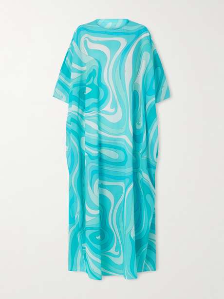 PUCCI's kaftan is printed with its glamorous 'Marmo' print that's inspired by Capri's vivid sea. It's made from airy cotton-voile and has a loose shape with floaty sleeves. Slip yours on over swimwear or style with wedge sandals and statement jewelry in the evening.