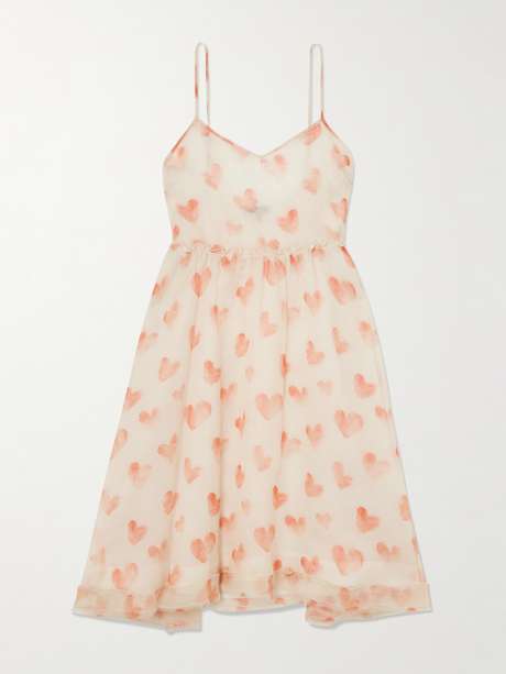 R13's romantic dress looks great contrasted with tights and biker boots. Made from crinkled silk-chiffon, it's printed with watercolor hearts and has a floaty shape with a ruffled trim along the waist. The frayed mini hem lends an undone feel.