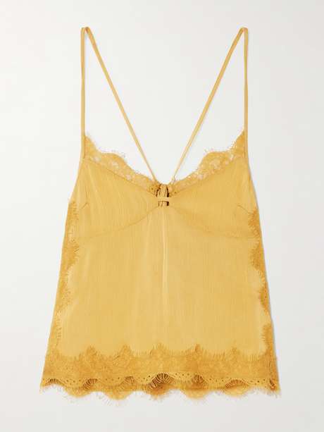 R13's camisole welcomes warmer days with its sunny hue. It's cut from lightweight crepon and has a sweetheart necklace trimmed with lace.