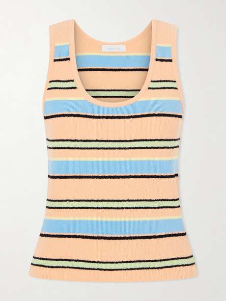 Rabanne’s tank is made from soft cotton-blend terry in vibrant multicolored stripes, offering a close, body-skimming fit. Its clean, sleeveless silhouette balances comfort with playful, contemporary energy, making it perfect for layering or wearing on its own.