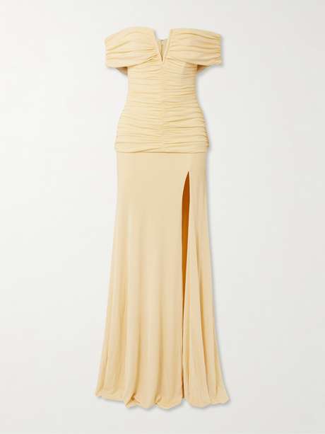 Rebecca Vallance's 'Zaley' gown is apt for both evening and daytime events. It's made from jersey with a ruched off-the-shoulder bodice and falls to a sleek maxi skirt with a thigh-high slit. Style yours with gold jewelry.